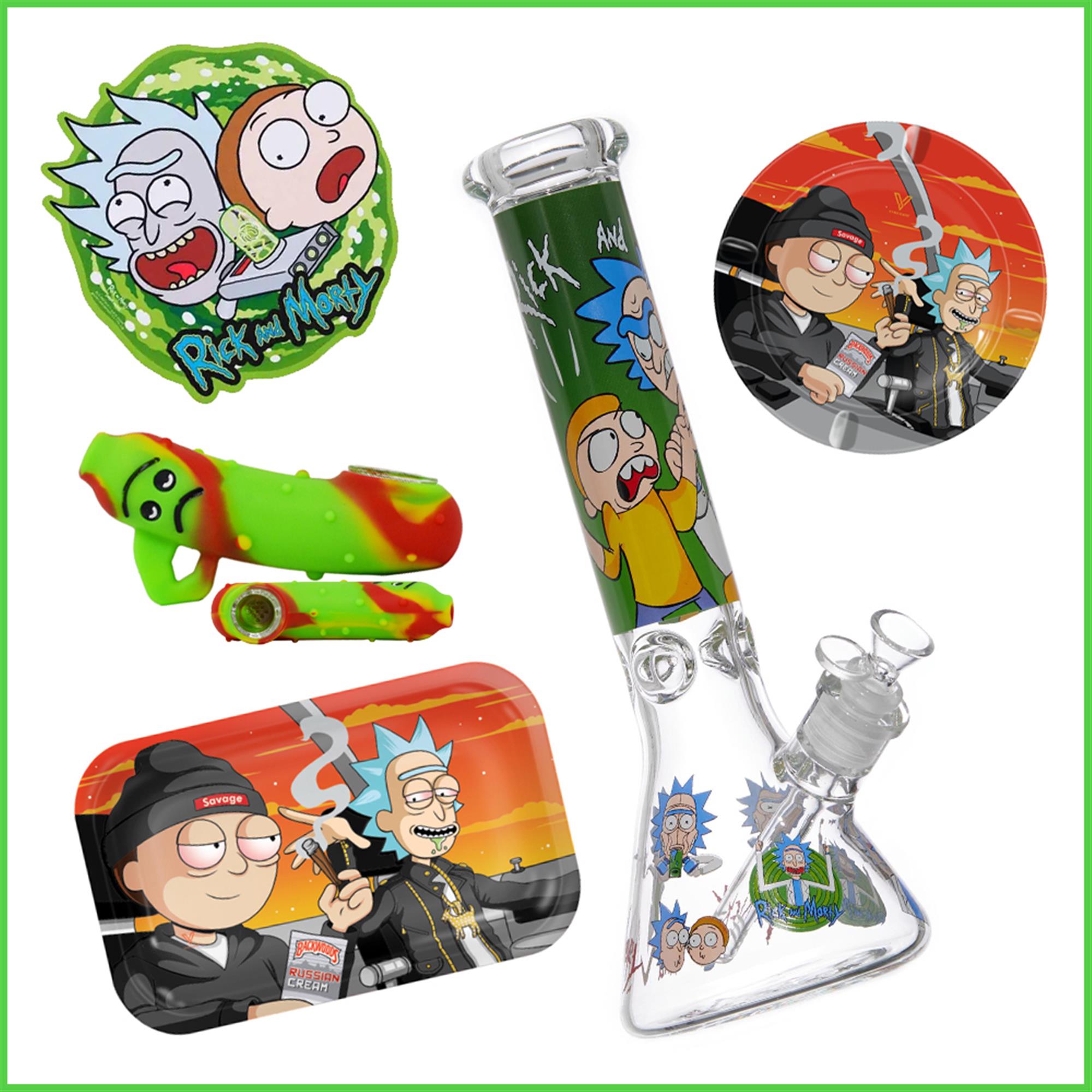Fun and Functional Accessories: Includes a Pickle Rick silicone hand pipe, rolling tray, and ashtray for a complete smoking experience.