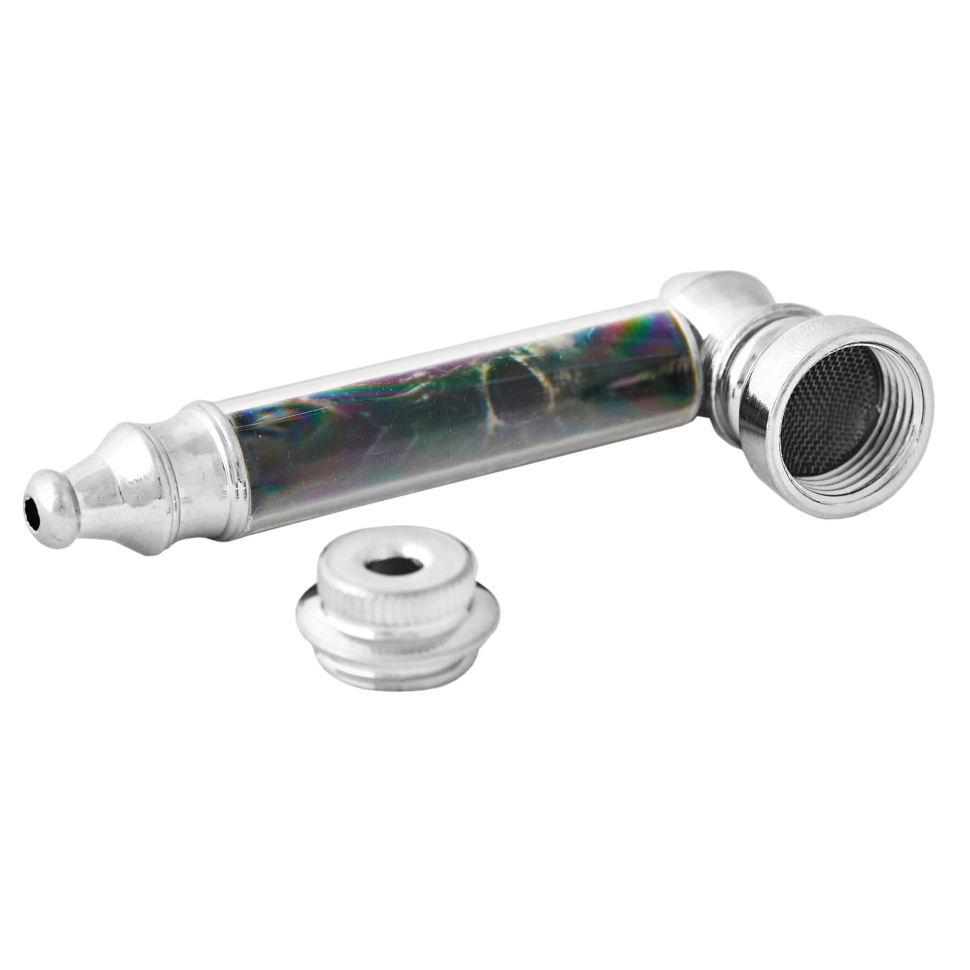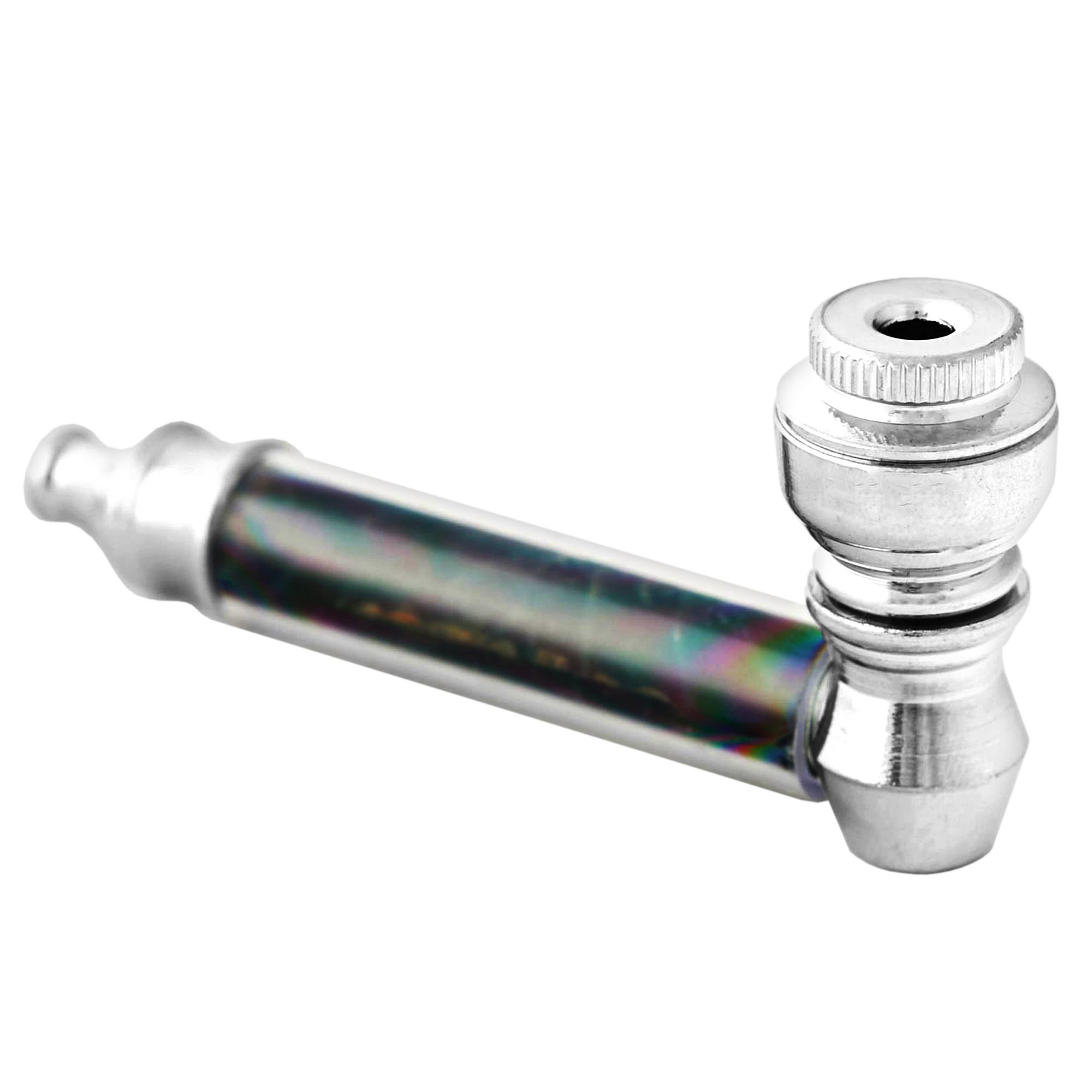 This simple metal pipe has threaded joints for easy disassembly and cleaning. Features an image of a screaming skull set on black background.