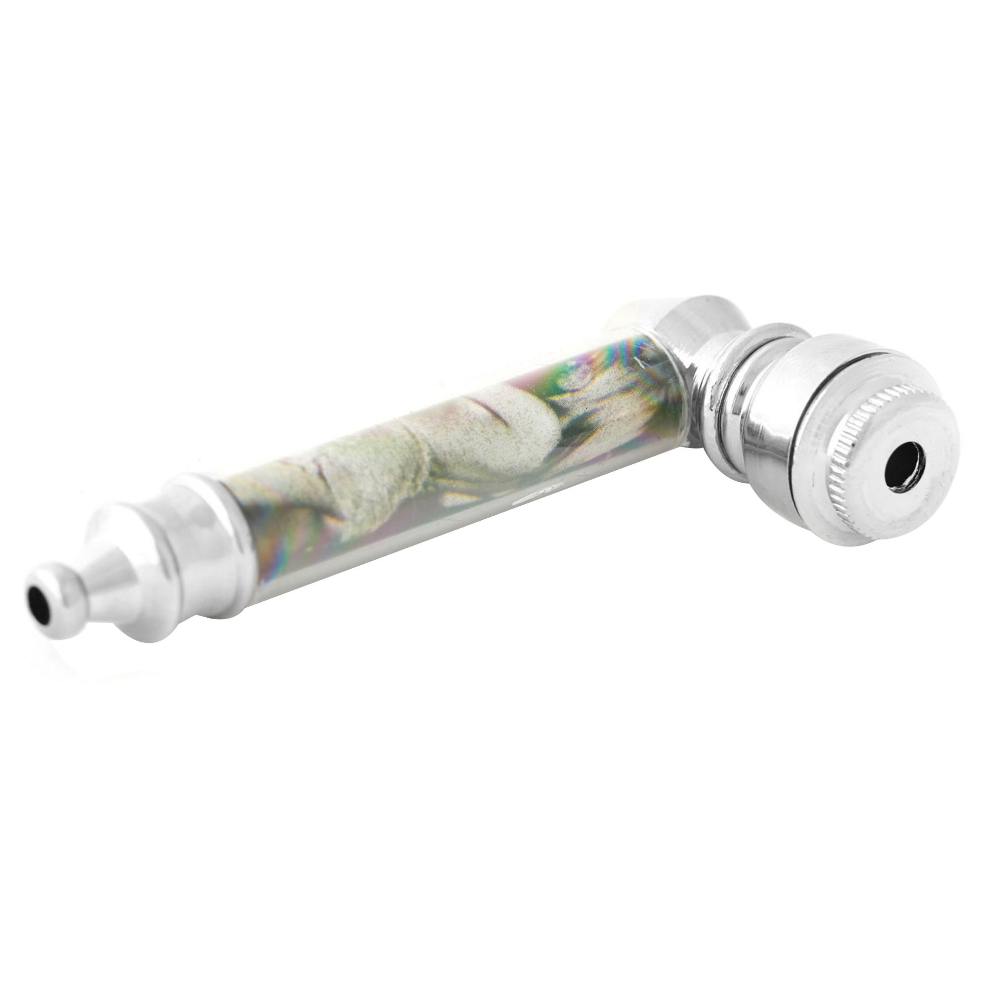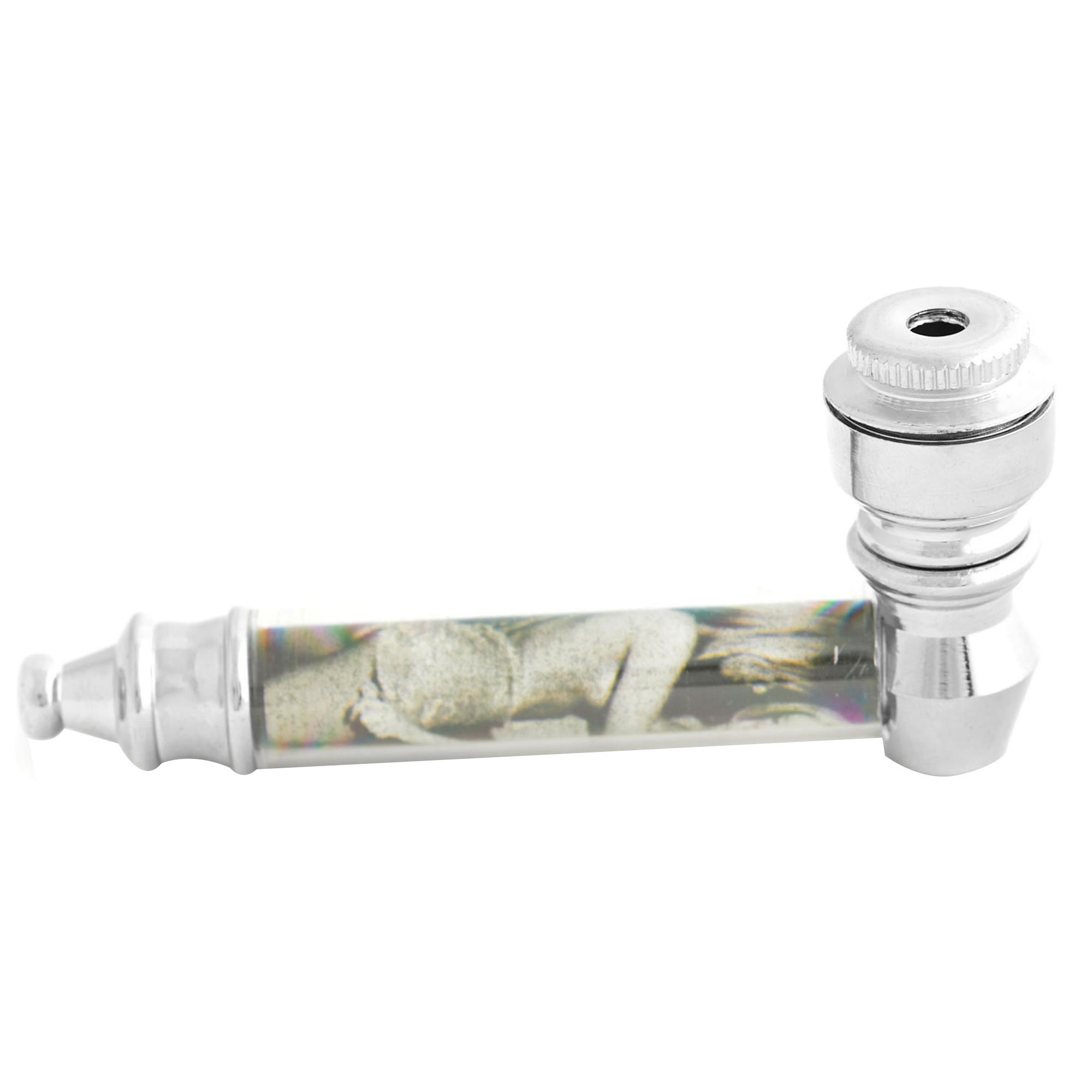 This simple metal pipe has threaded joints for easy disassembly and cleaning. Features the classic photograph of Tonya Chalkin's "The Kiss".